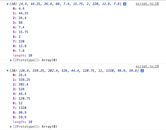 // (10) [22, 295, 176, 440, 37, 105, 10, 1100, 86, 52] (10) [4.4, 44.25, 26.4, 88, 7.4, 15.75, 2, 220, 12.9, 7.8] (10) [26.4, 339.25, 202.4, 528, 44.4, 120.75, 12, 1320, 98.9, 59.8]